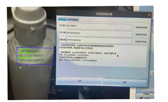 描述:OCR识别即常规的字符识别,系统具备常规的字库包含数字、字符、符号,可实现自动识别;也可以手动培训中文或其他类型的文字,建立模板,实现快速检测。标签检测主要分为:OCR、瑕疵检测、包装盒上的条码字符有无、错印和漏印、是否由脏污黑点等外观缺陷检测。识别和验证在各类纸箱、薄膜包装、瓶子、标签、卡片、证件、印刷物品上喷码、激光打印或热移印的数字、字母、符号,检测喷码或打印缺失、错喷、漏喷等缺陷。