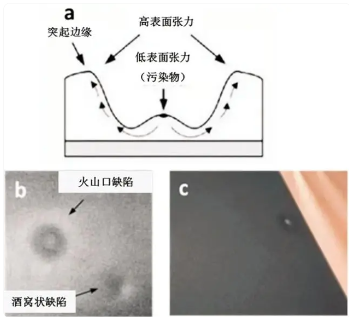 在涂布过程中,涂布基材受到较低表面张力物体(如油滴、灰尘等)的污染后,污染物周围的涂布溶液会流向具有较高表面张力的方向,形成像火山口或酒窝状的缩孔缺陷。材料之间表面张力不匹配,是产生缩孔缺陷的主要诱因,但浆料的粘度、流动性以及干燥风速和温度等都可能改变表面张力及其作用过程,从而诱发形成缩孔缺陷。例如,过低粘度(~1 500 mPa·s)的水性浆料在涂布后,溶液因表面张力不同会脱离疏水的石墨、积聚到表面张力较高的位置,形成缩孔缺陷。